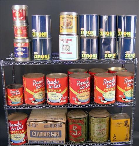 1 lot of 30 misc tins.... Popcorn, Zerone, Clabber Girl, oil, pepper, etc....