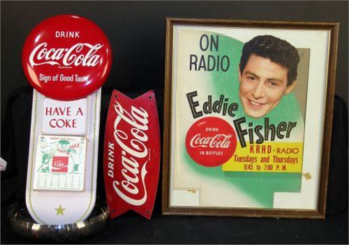 1 lot of 4, "Coca-Cola" items 1977 calendar, "Eddie Fisher" ad 18 x 15" metal fishtail sign 12 x 5" and a metal dish