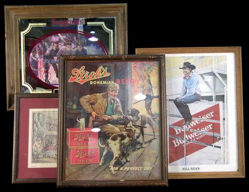 1 lot of 4 framed items:"Strohs Beer" Budweiser "Bull Rider" "Seagrams mirror and a print "Sympathy ll "