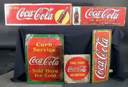 1 lot of 5, "Coca-Cola" signs tin "Curb Service" 28 x 20" "Take home cartons" 16 x 14" "Drink Coca-Cola in Bottles" 10 x 27" a porcelain "Drink Coca-Cola" 30 x 10 in poor condition and a "Drink Coca-Cola" w bottle in a yellow circle 11 x 3