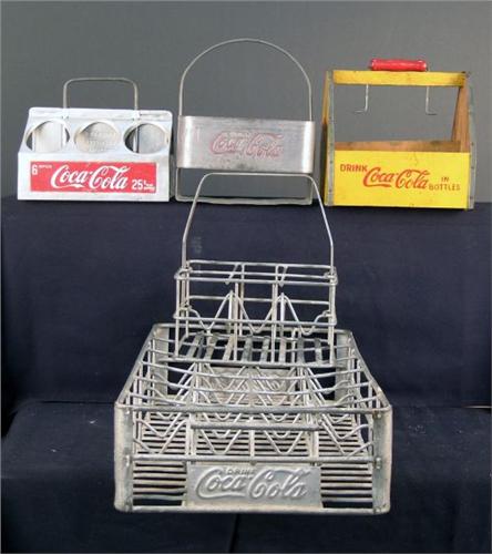 1 lot of 5 misc "Coca-Cola" bottle carriers 3 are metal 6-paks, 1 wood 6-pak, and a 24 bottle wire carrier