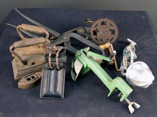 1 lot of 5 misc mechanical marvels... sad irons, pea huller, cherry pitter, hand crank juicer and a bunion tool for shoes...