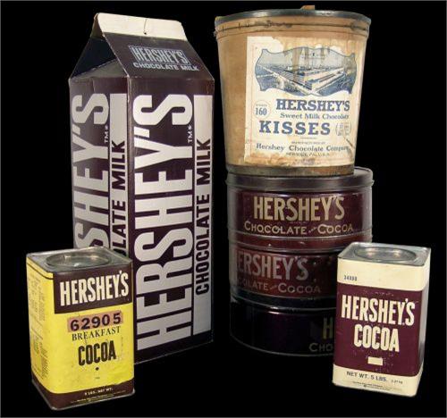 1 lot of 6 "Hersheys" items... 3 round tins, 2 cardboard tins, and a large oversize display of a Hershey's chocolate milk carton