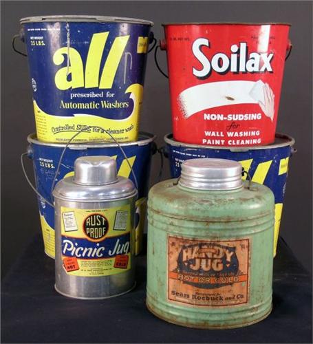 1 lot of 6 items, 3 "All" soapbuckets, 2 metal large "Thermos" jugs and a "Soilax" soap bucket