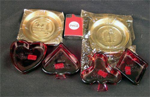 1 lot of 7, "Coca-Cola" misc items: 2 brass ash trays, 4 glass ash trays shaped like heart, spade, club & diamond and a pocket lighter