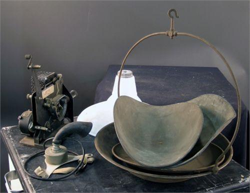 1 lot of 7 misc pieces of Americana miners' pan...telephone operators mouthpiece....white cased shade...3 scale pans and a small & early movie projector