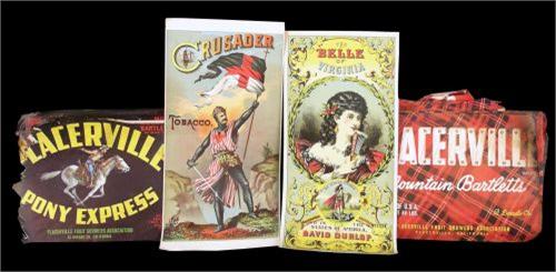 1 lot of labels 2 crusader tobacco 11 Belle of Virginia ... Placerville Fruit (damaged) and Placerville Pony Express (damaged)