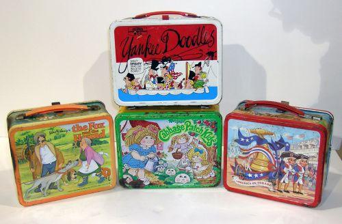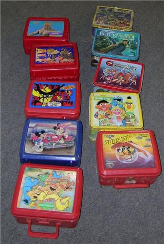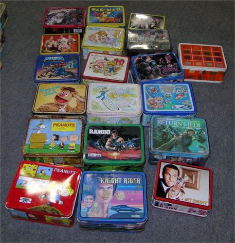1 lot of lunch pails (approx 32) Most are old type metal---few are plastic---some with thermoses .(Fox&Hounds, Cabbage Patch Kids, America on Parade, Yankee Doodles, 2-Sesame Street, Mickey & Minnie Mouse, Dick Tracy, Alf, WWF Hulk Hogan, Jetsons, Thunder
