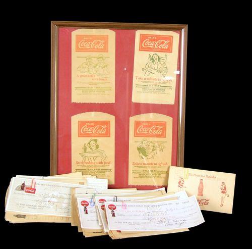 1 lot of misc "Coca-Cola" items Bottlers checks, post-cards & drip protectors that slid over a wet bottle
