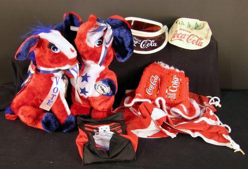1 lot of misc "Coca-Cola" items dolls, cloth totes, visors and a knit hat with can panels
