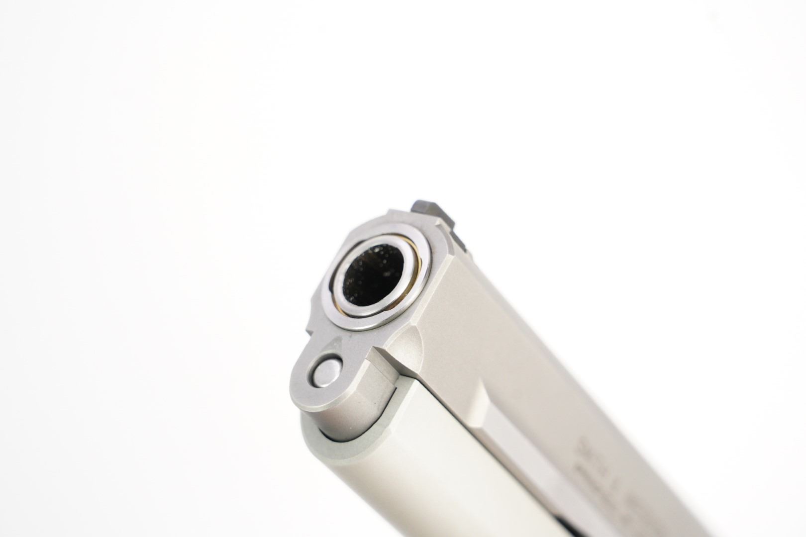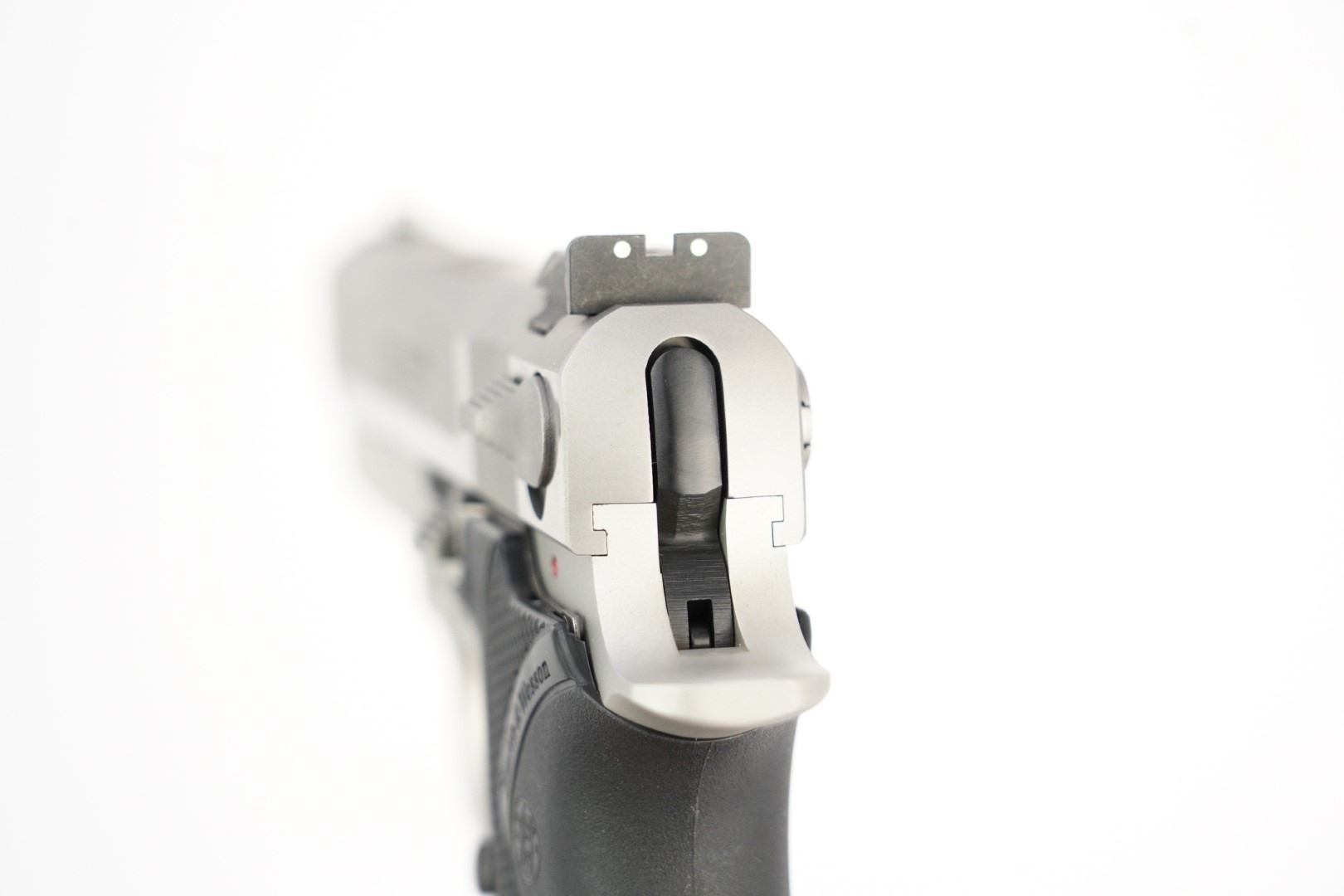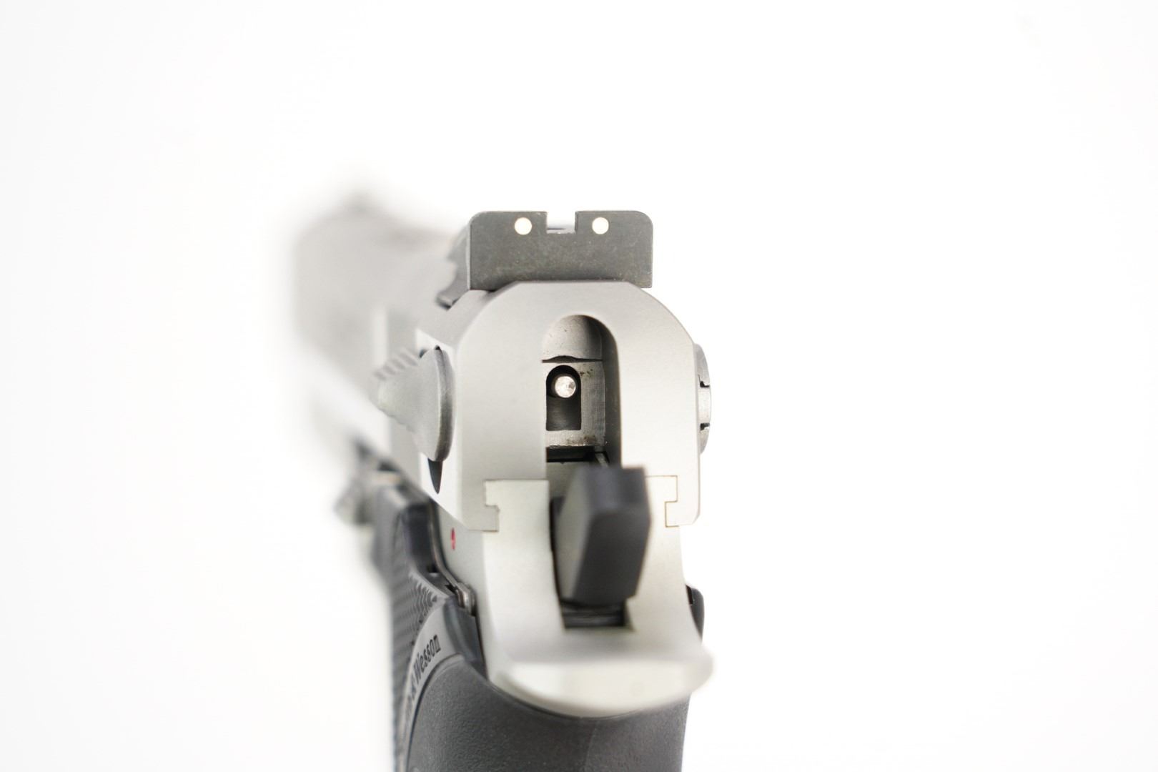 Sights / Optics: The front sight is a blade with a white dot and is dovetailed into the slide. The rear sight is a fully adjustable square notch sight with two white dots, it is dovetailed into the slide and has two set screws.