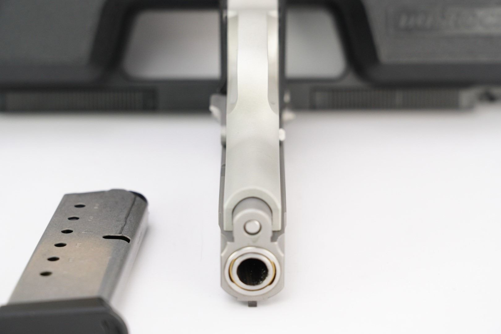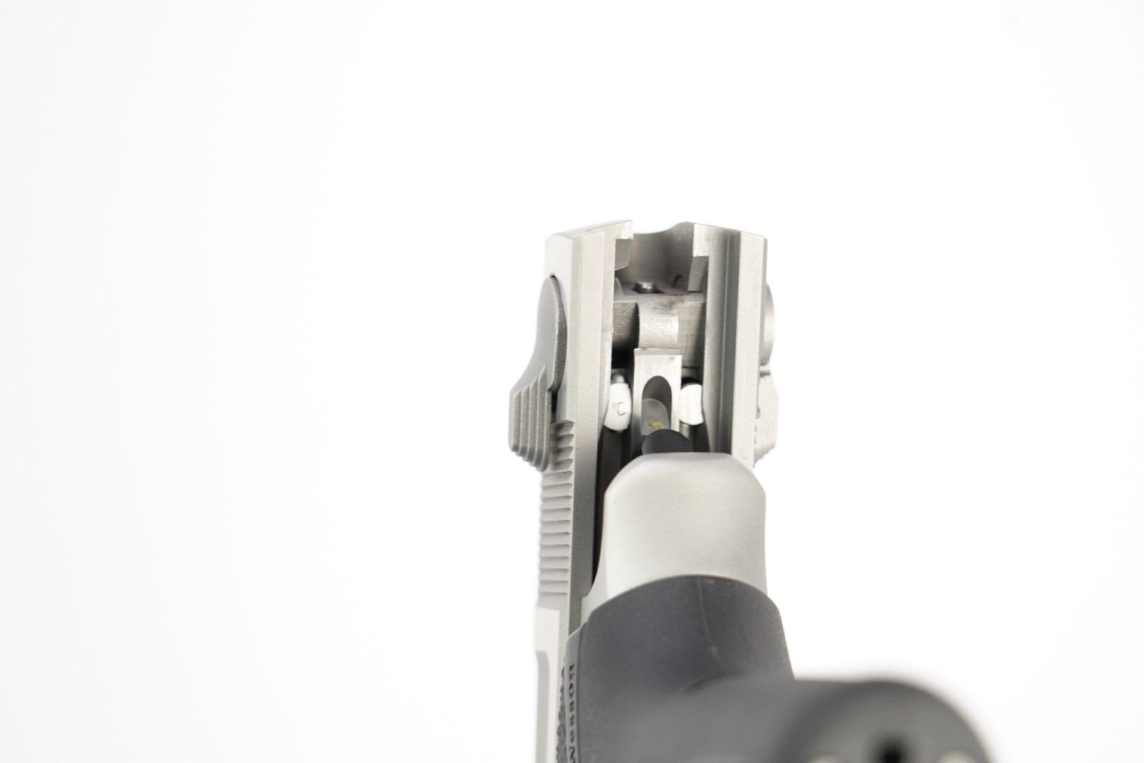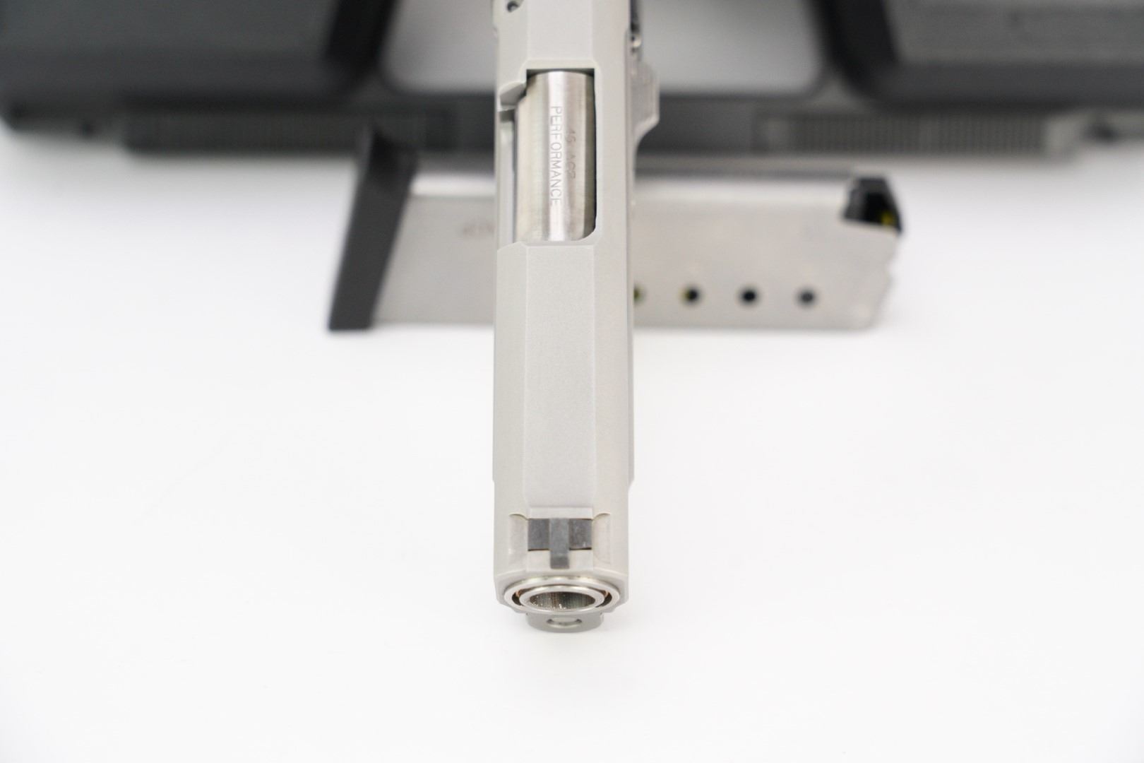 Sights / Optics: The front sight is a blade with a white dot and is dovetailed into the slide. The rear sight is a fully adjustable square notch sight with two white dots, it is dovetailed into the slide and has two set screws.