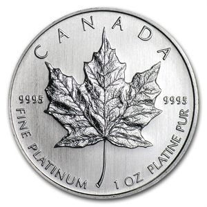 1 oz Canadian Platinum Maple Leaf - Random Year **|**|** Year: 1988-Current ; Mint Mark: Uncirculated ; Grade: N/A ; Denomination: 50 ; MSRP: $2700