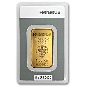 1 oz Heraeus Gold Bar New .9999 Fine **|**|** 1 oz Heraeus Gold Bar New .9999 Fine, Diameter: 40.5/23.4 mm, Thickness: 2.1 mm ; MSRP: $6100