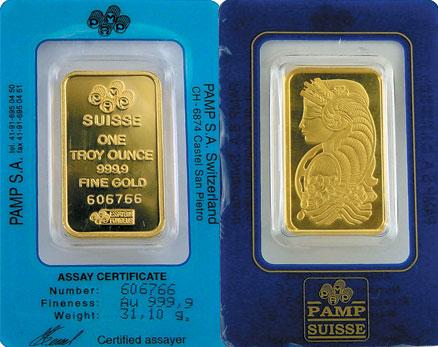 A fine .9999 Pure gold 1 oz. Ingot- From Pamp or Credit Suisse-