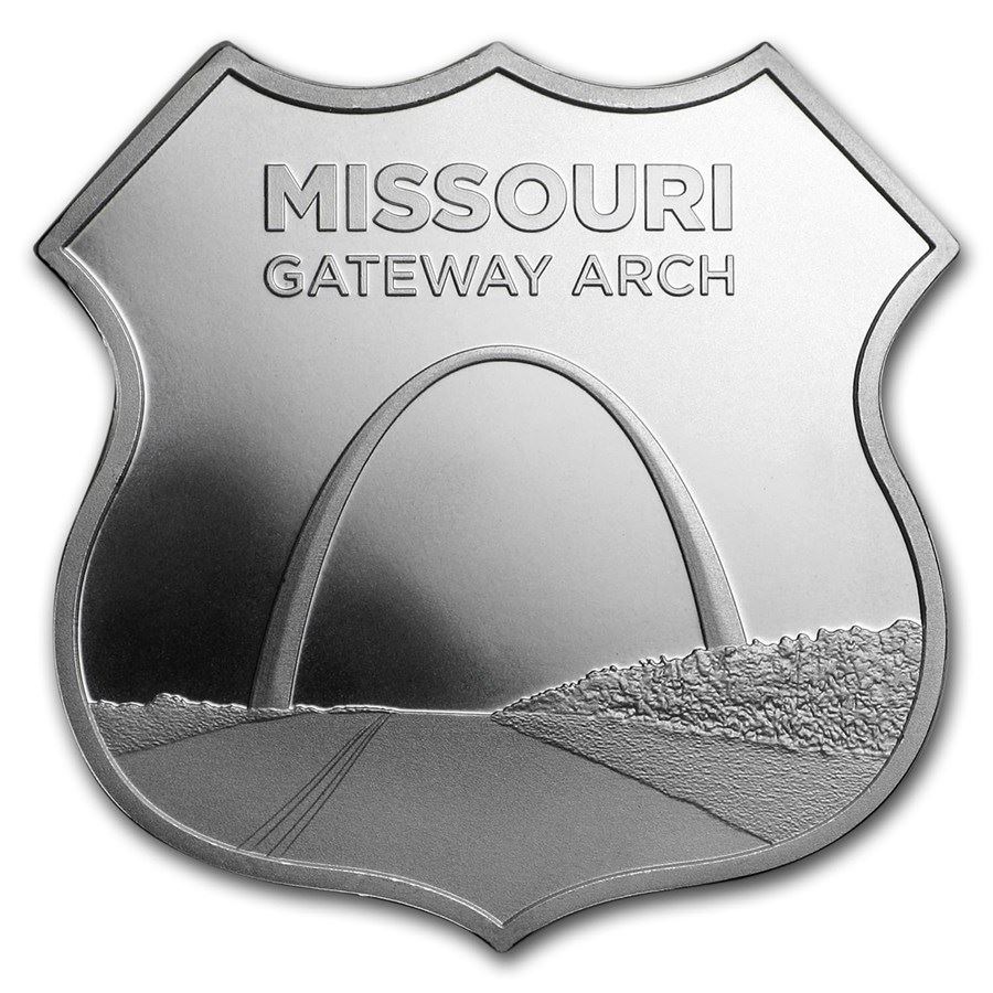 1 oz Silver - Icons of Route 66 Shield (Missouri Gateway Arch)