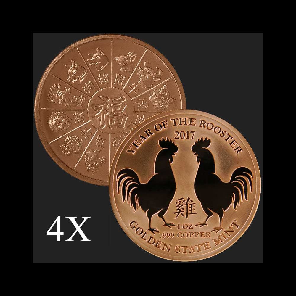 4 units of 1 oz Year of the Rooster .999 Fine Copper Bullion Round