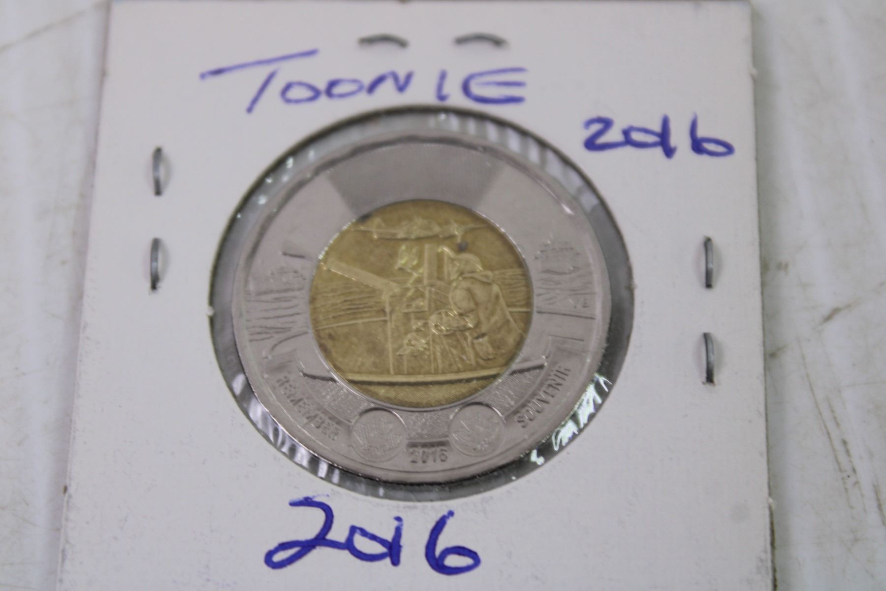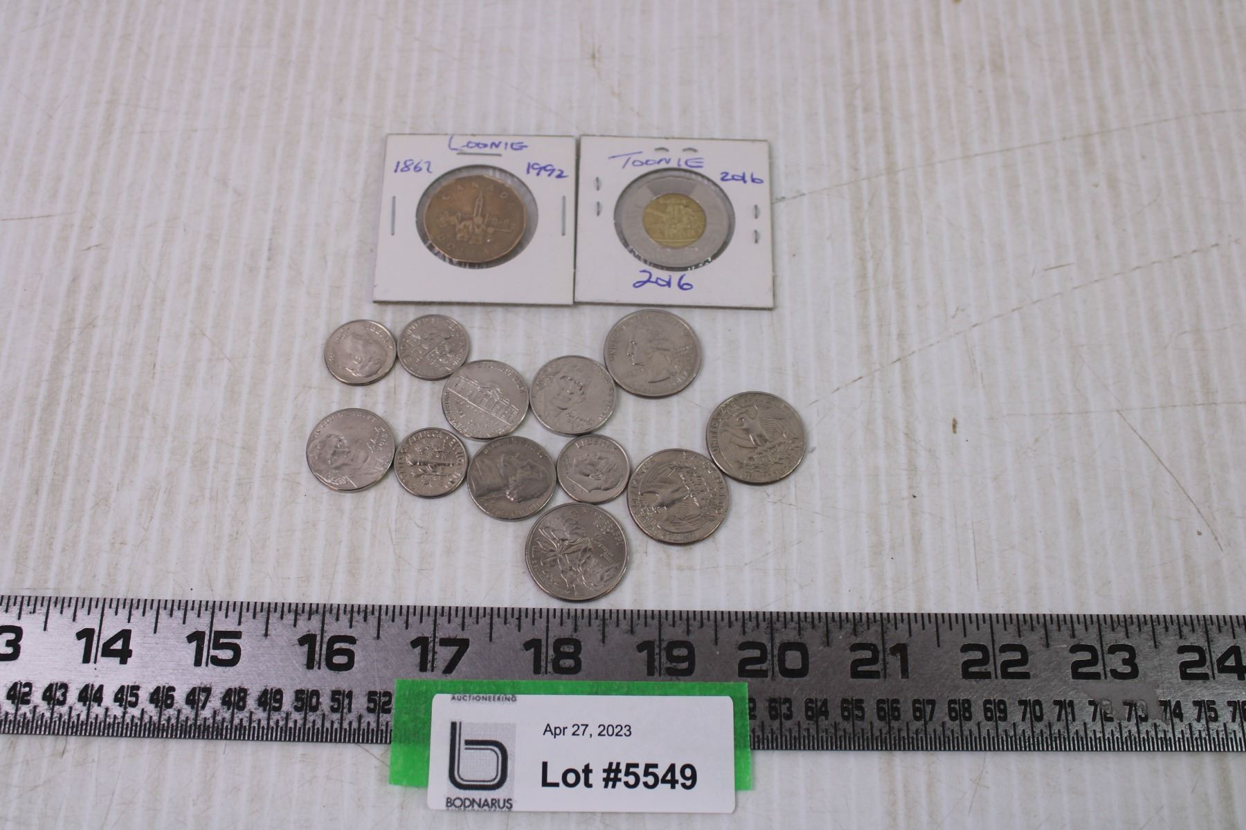 1 pkgd Loonie, 1 Pkgd Twoonie and assorted American coins