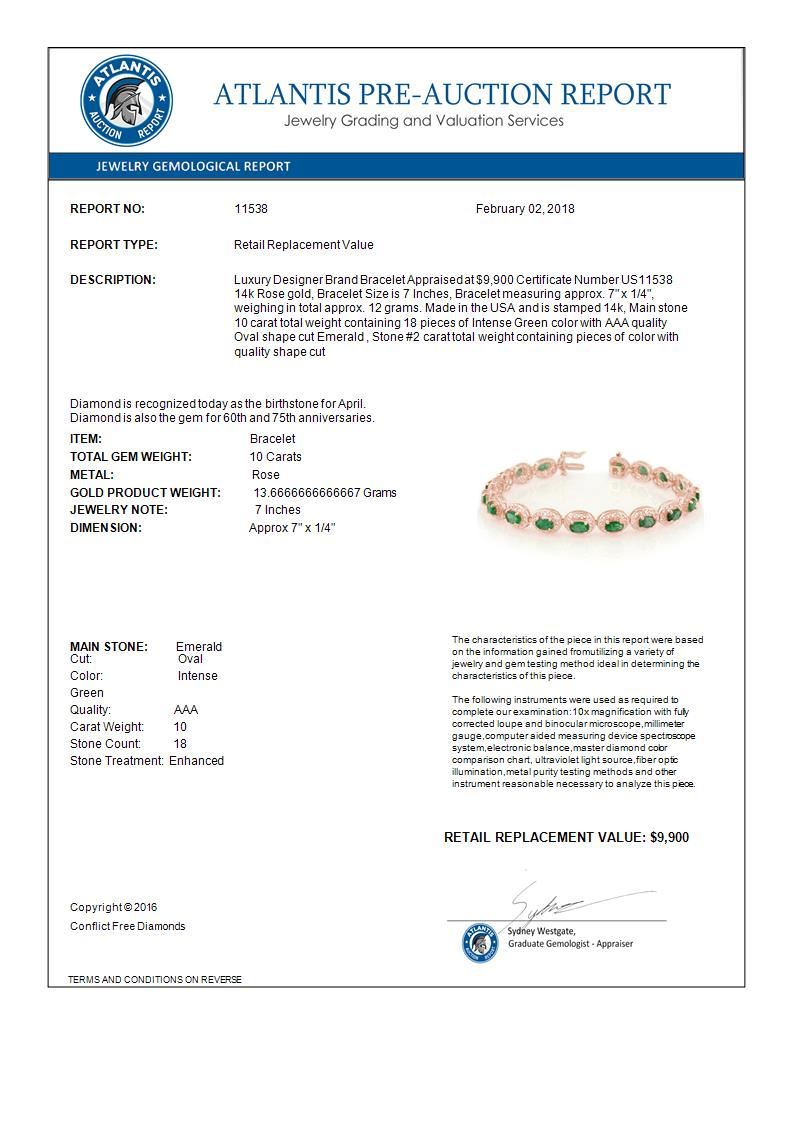 REF-150W4F -11538 ---- 10.0 CTW Emerald Bracelet 14K Rose Gold ---- Luxury Designer Brand Bracelet Appraised at $9,900 Certificate Number US11538 14k Rose gold, Bracelet Size is 7 Inches, Bracelet measuring approx. 7" x 1/4", weighing in total approx. 12 grams. Made in the USA and is stamped 14k, Main stone 10 carat total weight containing 18 pieces of Intense Green color with AAA quality Oval shape cut Emerald , Stone #2 carat total weight containing pieces of color with quality shape cut