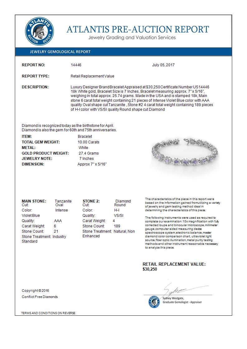 10.0 CTW Tanzanite & Diamond Bracelet 18K White Gold ---- Luxury Designer Brand Bracelet Appraised Retail Price at $30,250 ---- SKU Number US14446 18k White gold Bracelet Size is 7 Inches, Bracelet measuring approx. 7" x 5/16", weighing in total approx. 25.74 grams. Made in the USA and is stamped 18k, Main stone 6 carat total weight containing 21 pieces of Intense Violet Blue color with AAA quality Oval shape cut Tanzanite , Stone #2 4 carat total weight containing 189 pieces of H-I color with VS/SI quality Round shape cut
