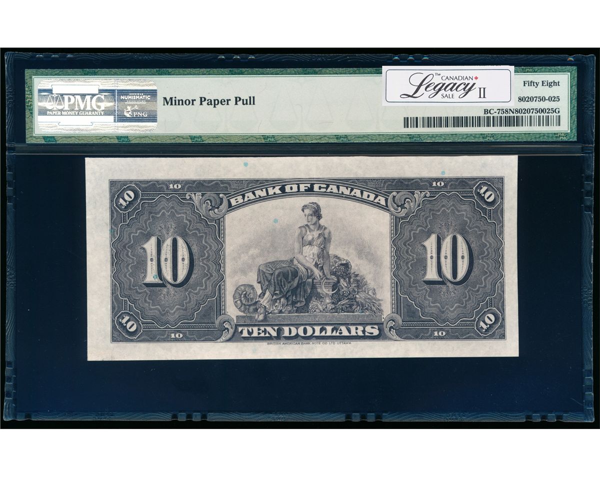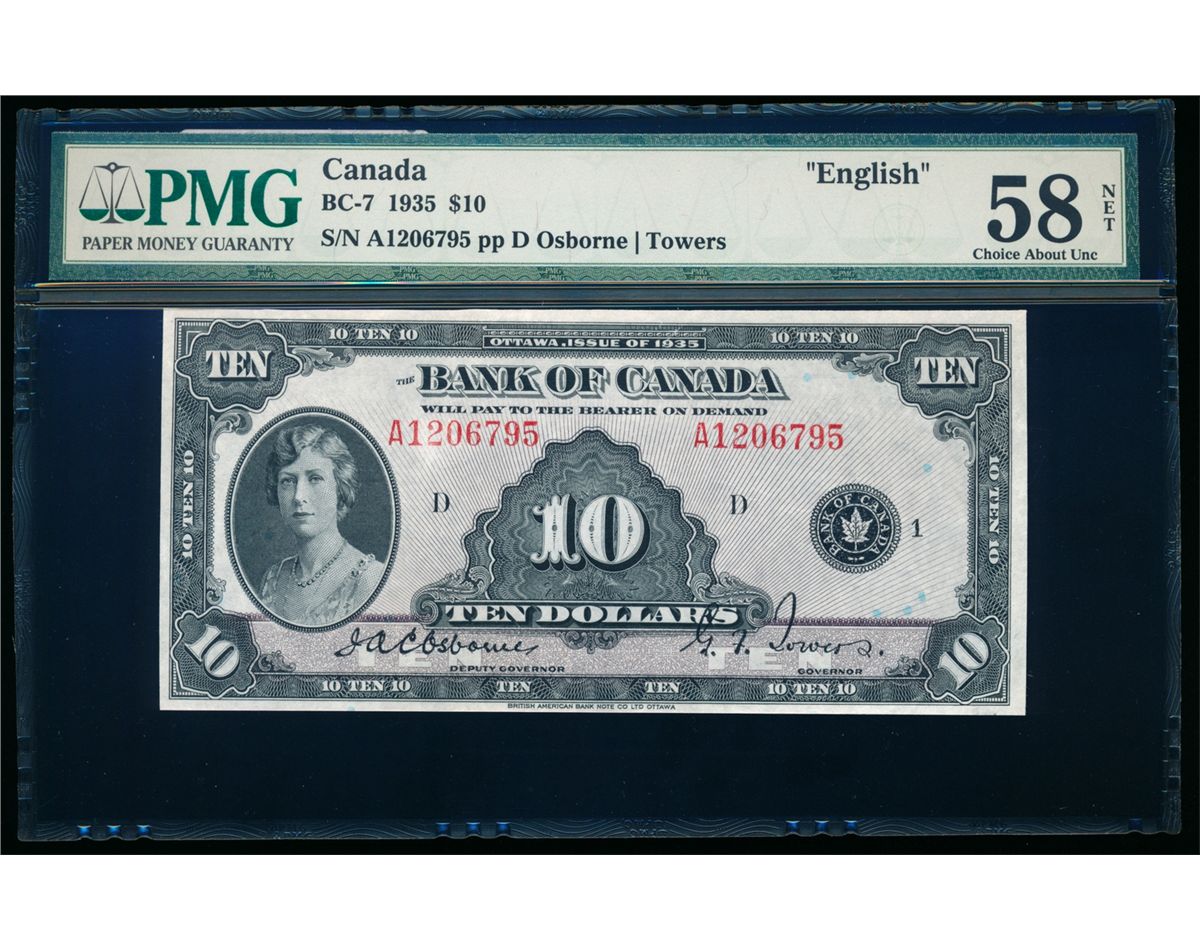 $10.00. 1935. BC-7. Osborne-Towers. English text. Series 'A'. No.1206795/D. PMG graded Very Choice About Uncirculated-58 NET. (Note: minor paper pull). From the Rosedale Collection.