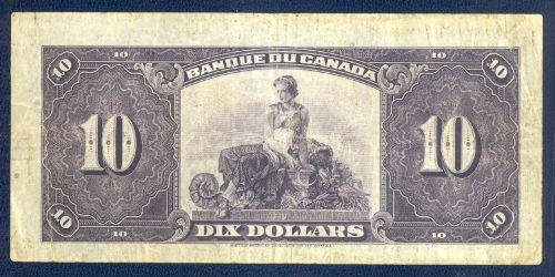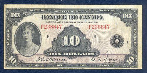 Bank of Canada; $10.00 1935 French note BC-8, VF, signature Osborne-Towers, serial F238847. Decent condition with no problem.