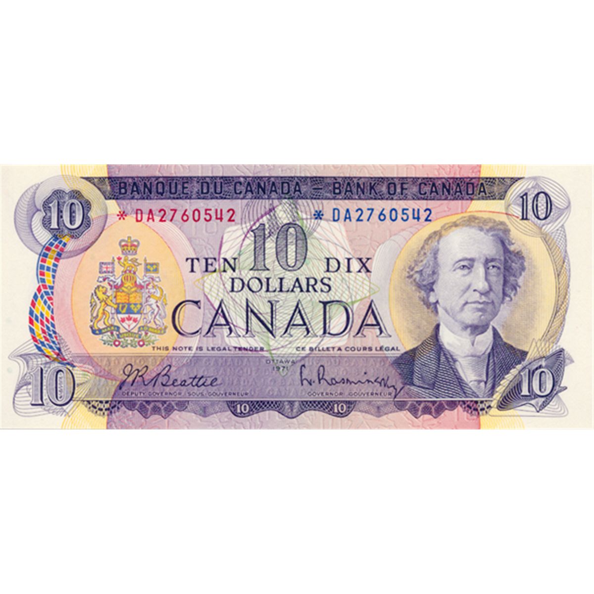 $10.00. 1971 Issue. BC-49aA. Beattie-Rasminsky. No. *DA2760542. PCGS graded Gem UNC-66PPQ.