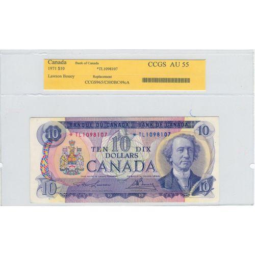 Bank of Canada, $10.00 Replacement note 1971, graded CCGS AU55, Charlton # BC-49cA, signature Lawson Bouey, serial *TL1098107.
