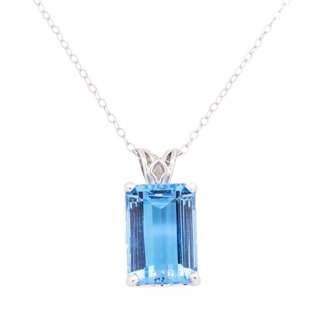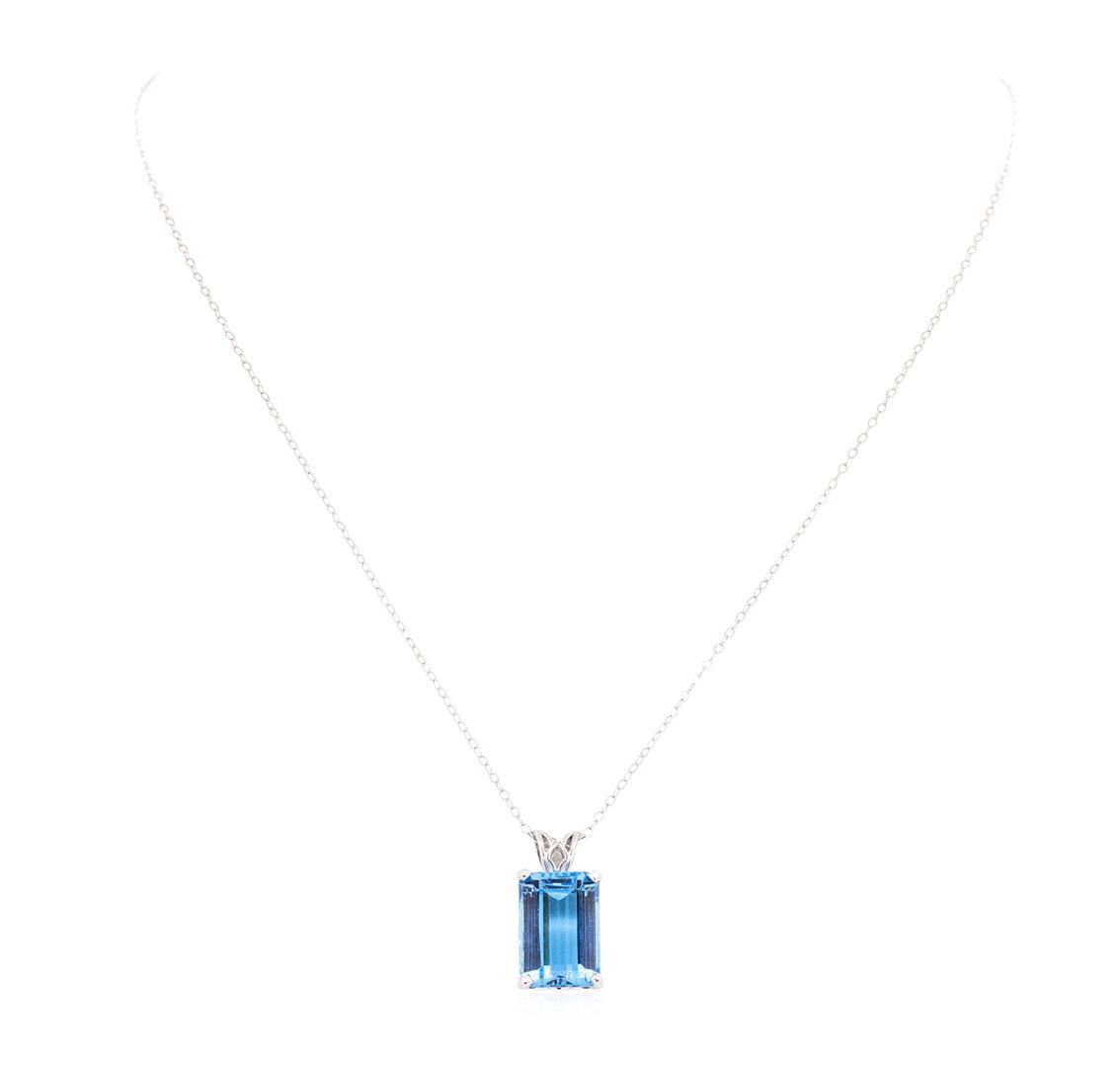 One pendant with chain featuring: 14KT white gold weighing 5.5 grams containing one blue topaz weighing 10.00ct. The attached chain measures eighteen inches in length.