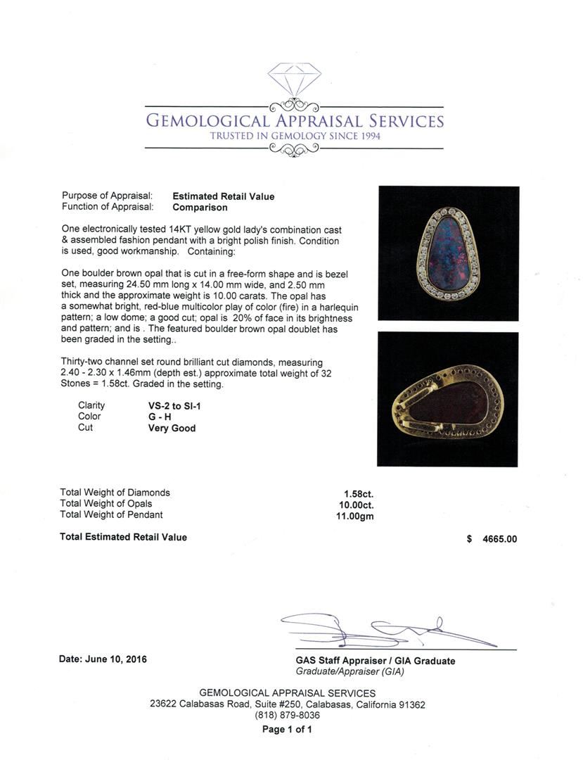 One electronically tested 14KT yellow gold lady's combination cast & assembled fashion pendant with a bright polish finish. Condition is used, good workmanship. Containing: One boulder brown opal that is cut in a free-form shape and is bezel set, measuring 24.50 mm long x 14.00 mm wide, and 2.50 mm thick and the approximate weight is 10.00 carats. The opal has a somewhat bright, red-blue multicolor play of color (fire) in a harlequin pattern; a low dome; a good cut; opal is 20%. of face in its brightness and pattern; and is. The featured boulder brown opal doublet has been graded in the setting. Thirty-Two channel set round brilliant cut diamonds, measuring 2.40 - 2.30 x 1.46mm (depth est.) approximate total weight of 32 Stones = 1.58ct. Graded in the setting. Clarity: VS-2 to SI-1. Color: G - Very Good. Total Weight of Diamonds 1.58ct. Total Weight of Opals 10.00ct. Total Weight of Pendant 11.00gm. GAS Appraised at $4,665.00.