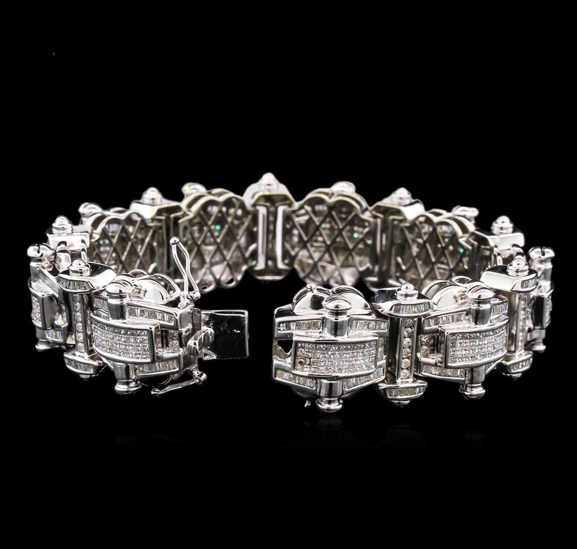 One electronically tested 14KT white gold man's combination cast & assembled fashion bracelet with a tongue clasp with foldover safety with a bright polish finish. The featured man's bracelet measures 8 inches in length. Identified with markings of "14K". Condition is new, good workmanship. Containing: Three Hundred Ninety-Six invisible set princess cut diamonds, measuring 1.20 x 1.15 x 0.86mm (depth est.) approximate total weight of 396 Stones = 3.95ct. Graded in the setting. Clarity: SI-1 to I-1. Color: G - I. Cut Good Four Hundred channel set baguette cut diamonds, measuring from 1.30 x 0.90 x 0.77mm (depth est.) to 1.50 x 1.00 x 0.85mm (depth est.) approximate total weight of 400 Stones = 4.04ct. Graded in the setting. Clarity: SI-2 to I-1. Color: H - Good Eighty-Four channel set round brilliant cut diamonds, measuring 1.90 - 1.70 x 1.17mm (depth est.) approximate total weight of 84 Stones = 2.01ct. Graded in the setting. Clarity: I-1 to I-2. Color: H - Good. Total Weight of Diamonds 10.00ct. Total Weight of Bracelet120.00gm. GAS Appraised at $25,130.00.
