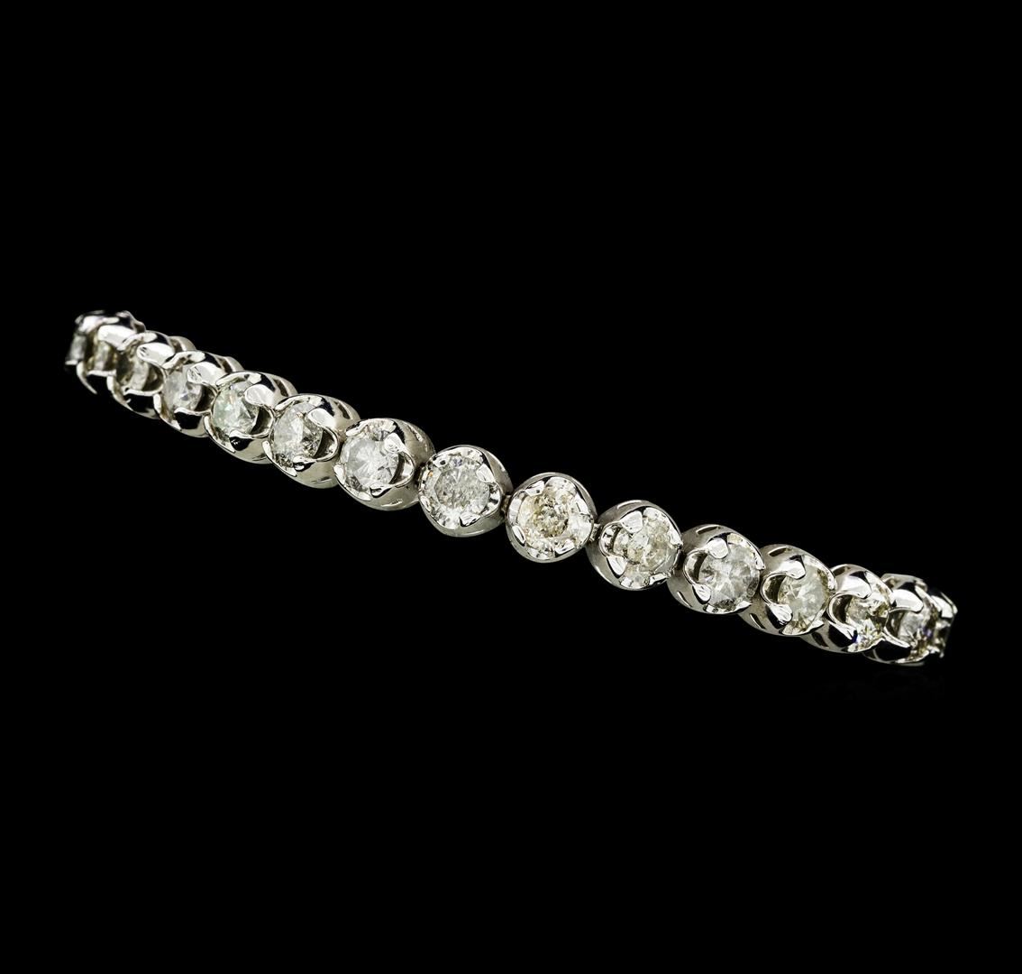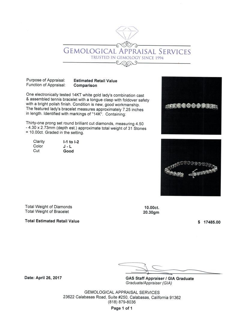 One electronically tested 14KT white gold lady's combination cast & assembled tennis bracelet with a tongue clasp with foldover safety with a bright polish finish. The featured lady's bracelet measures approximately 7.25 inches in length. Identified with markings of '14K'. Condition is new, good workmanship. Containing: Thirty-One prong set round brilliant cut diamonds, measuring 4.50 - 4.30 x 2.73mm (depth est.) approximate total weight of 31 Stones = 10.00ct. Graded in the setting. Color J - L Clarity I-1 to I-2 Cut Good. Total Weight of Diamonds 10.00ct.. Total Weight of Bracelet 20.30gm GAS Appraised at $17485.00. GAS Appraised at $17,485.00.