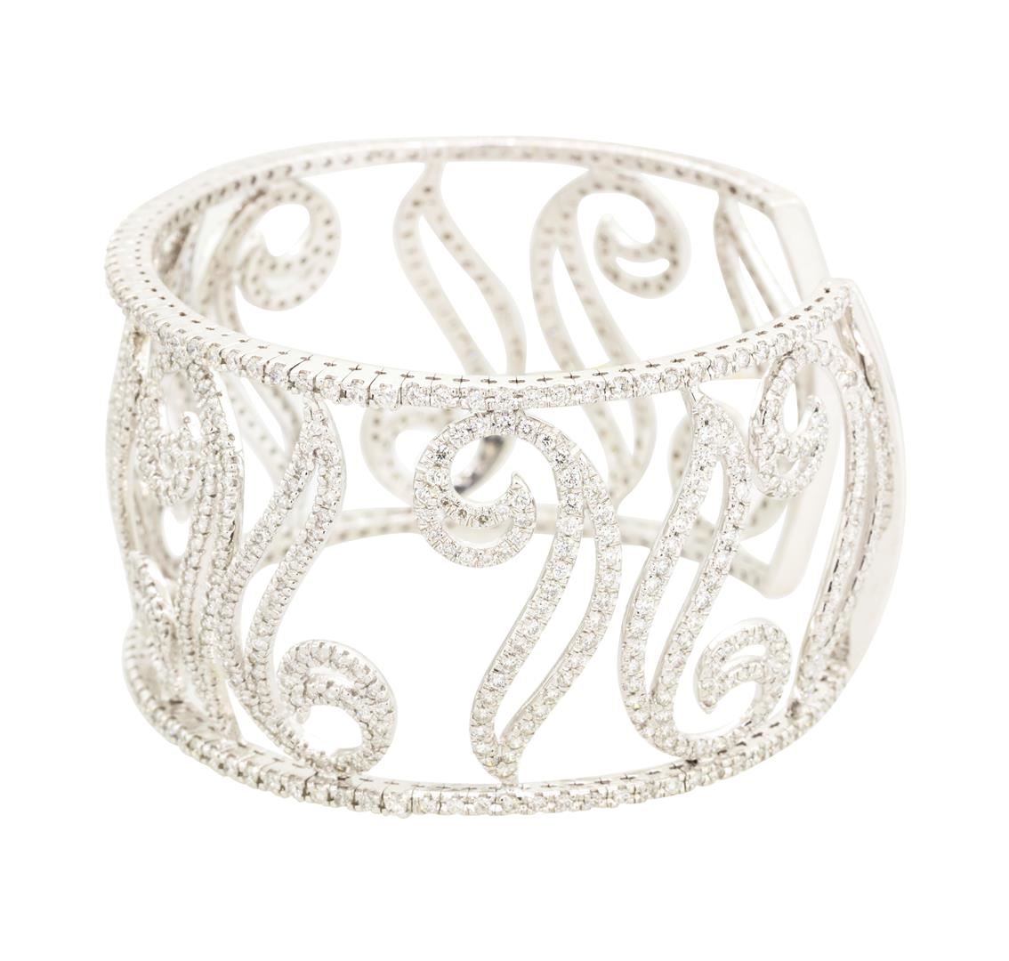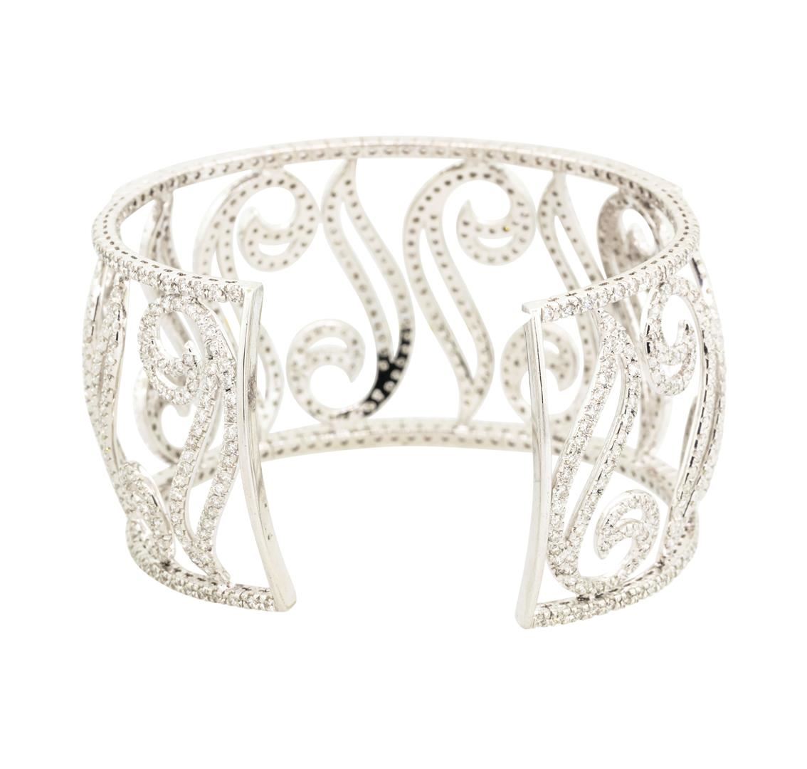 One electronically tested 14KT white gold lady's cast fashion cuff bracelet with a bright polish finish. The featured lady's cuff bracelet is flexible and measures approximately thiry eight millimeters wide and has a circumference of six and a half inches. Condition is new, good workmanship. Containing: One Hundred Fifty-Two prong set round brilliant cut diamonds, measuring 2.00 - 1.90 x 1.21mm (depth est.) approximate total weight of 152 Stones = 4.25ct. Graded in the setting. Color H - I Clarity SI-2 to I-1 Cut Good Six Hundred Forty-Eight prong set round brilliant cut diamonds, measuring 1.40 - 1.30 x 0.81mm (depth est.) approximate total weight of 648 Stones = 5.75ct. Graded in the setting. Color H - I Clarity SI-2 to I-1 Cut Good. Total Weight of Diamonds 10.00ct.. Total Weight of Bracelet 57.50gm GAS Appraised at $21370.00. GAS Appraised at $21,370.00.
