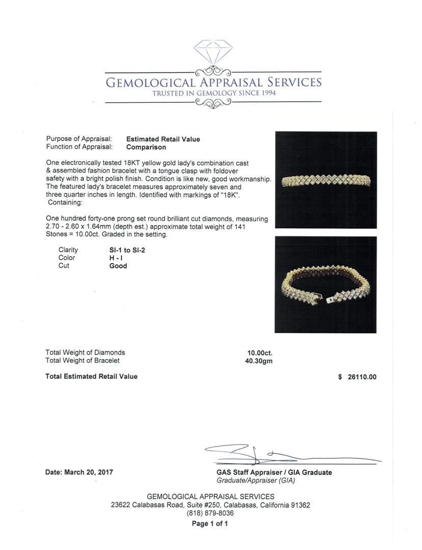 One electronically tested 18KT yellow gold lady's combination cast & assembled fashion bracelet with a tongue clasp with foldover safety with a bright polish finish. The featured lady's bracelet measures approximately seven and three quarter inches in len GAS Appraised at $26,110.00.