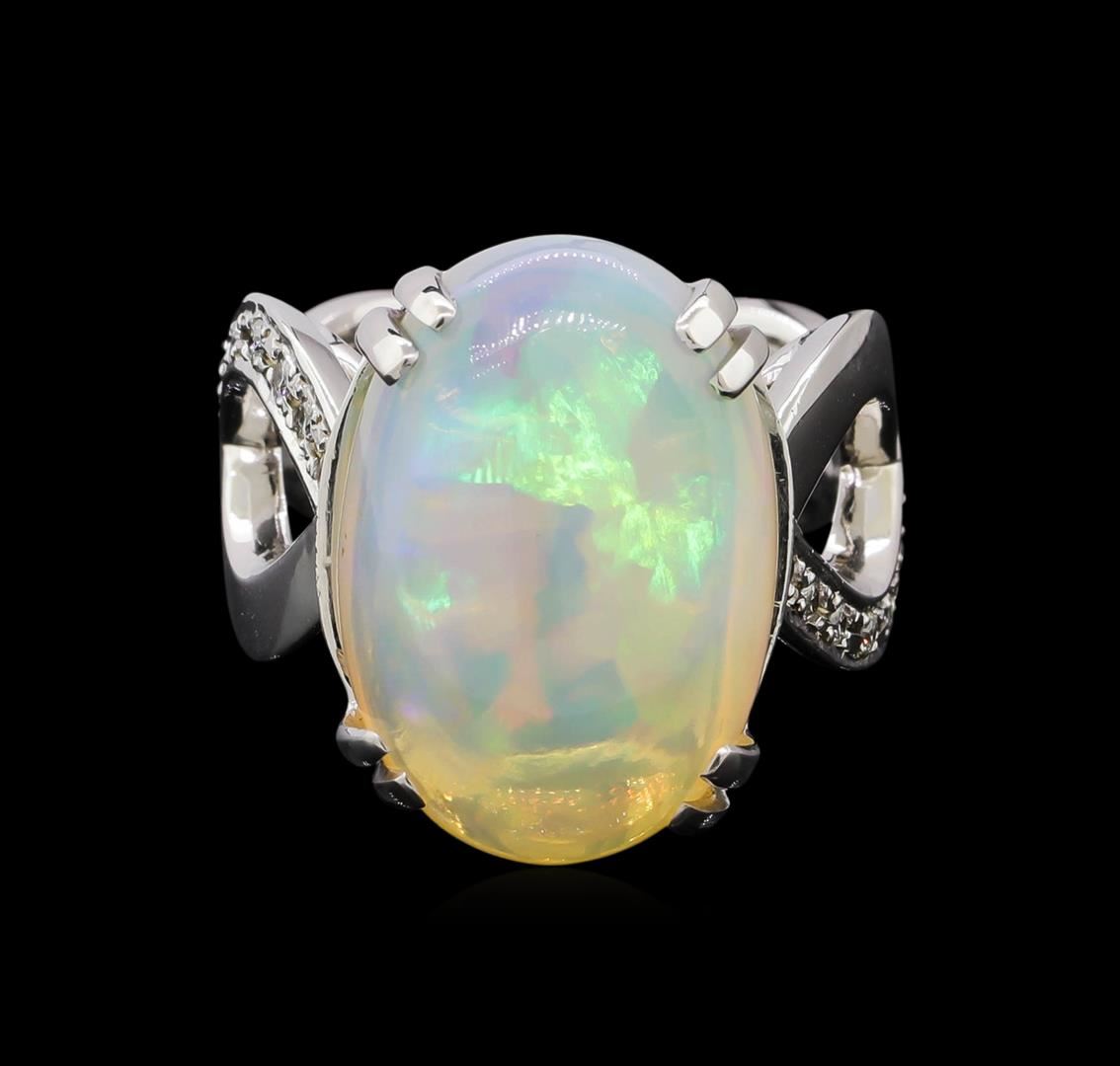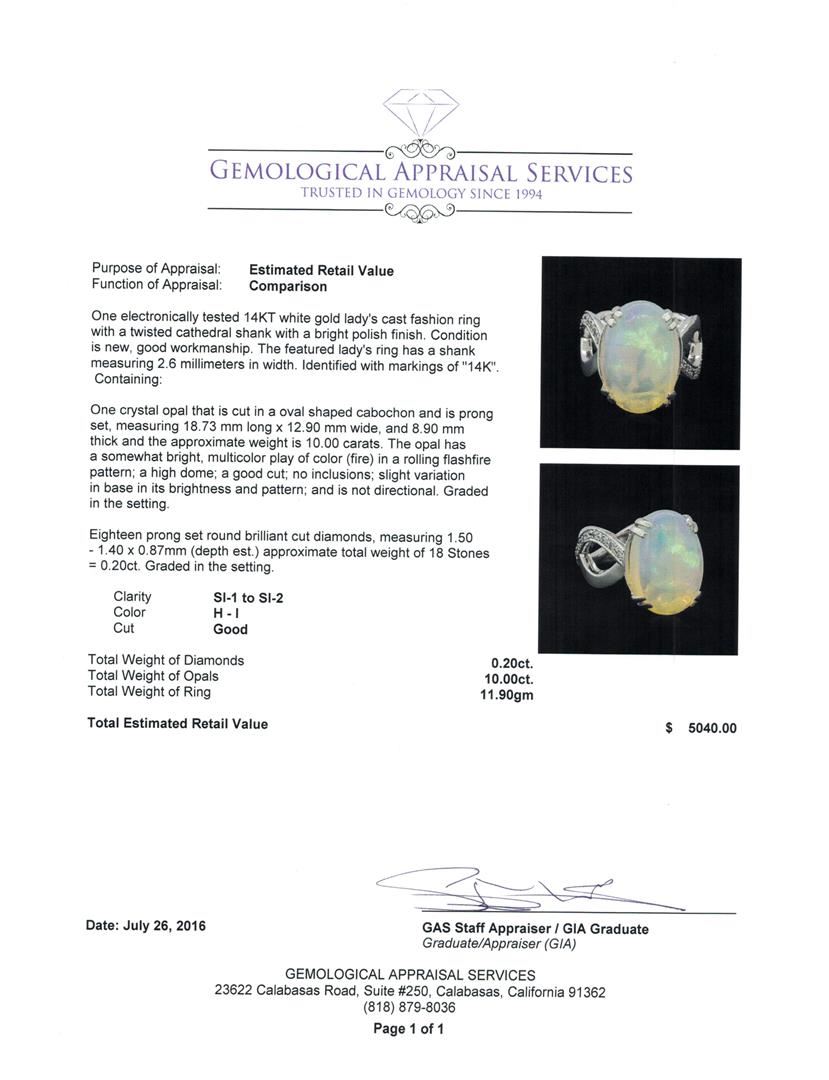 One electronically tested 14KT white gold lady's cast fashion ring with a twisted cathedral shank with a bright polish finish. The featured lady's ring has a shank measuring 2.6 millimeters in width. Identified with markings of '14K'. Condition is new, good workmanship. Containing: One crystal opal that is cut in a oval shaped cabochon and is prong set, measuring 18.73 mm long x 12.90 mm wide, and 8.90 mm thick and the approximate weight is 10.00 carats. The opal has a somewhat bright, multicolor play of color (fire) in a rolling flashfire pattern; a high dome; a good cut; no inclusions; slight variation in base in its brightness and pattern; and is not directional. Graded in the setting. Eighteen prong set round brilliant cut diamonds, measuring 1.50 - 1.40 x 0.87mm (depth est.) approximate total weight of 18 Stones = 0.20ct. Graded in the setting. Clarity SI-1 to SI-2. Color: H - I Cut Good. Total Weight of Diamonds 0.20ct.. Total Weight of Opals 10.00ct.. Total Weight of Ring 11.90gm. GAS Appraised at $5,040.00.
