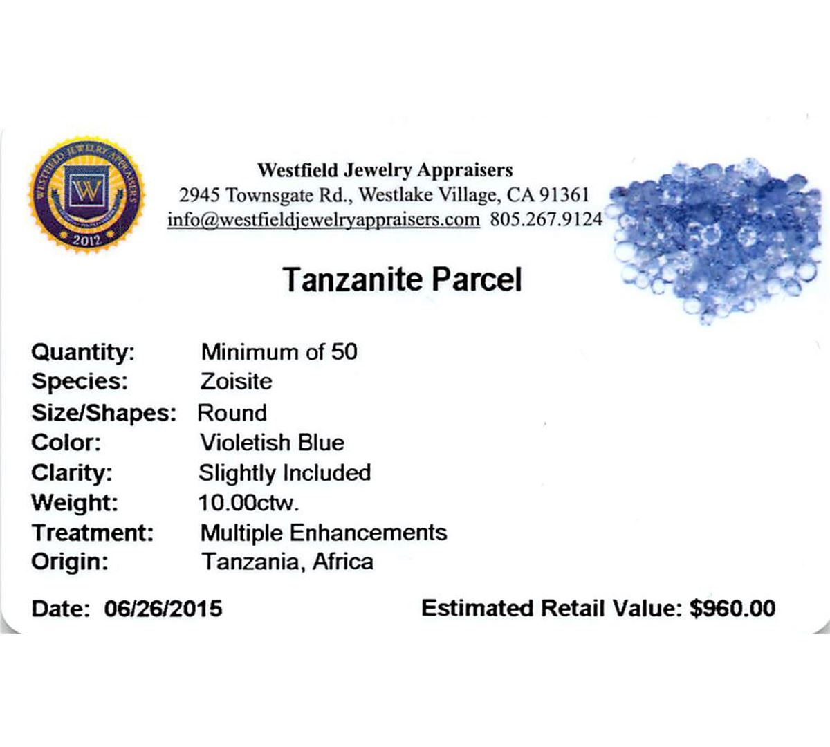 Fifty round mixed cut natural tanzanites, measuring 2.00 - 2.00 x 1.30 mm, exact total weight 10.00ct., clarity is slightly included, type I, medium, very slightly grayish, violetish blue color, (GIA vB 5/3), cut is good. Measurements & the color grade are an average for the group, Color grade is an average for the group, Transmitting light with no distortion, transparent, Naturally occurring internal & external characteristics are present, Indications of multiple laboratory enhancements, including high temperature heat treatment. Westfield Appraised at $960.00.