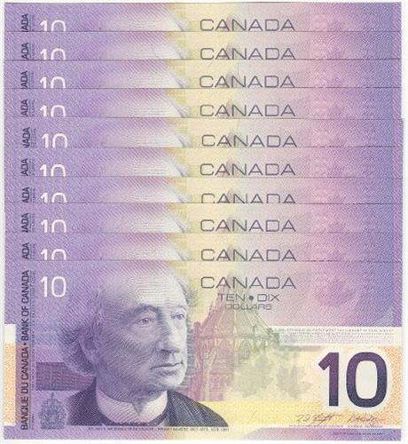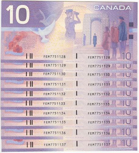 Bank of Canada; $10.00 insert 2002, BC-63bA, Gem UNC, signature; Knight Dodge, serial; FEM7751128 to FEM7751137. Lot of 10 consecutive insert notes (replacement). From the same sheets as next lot.