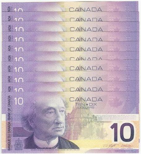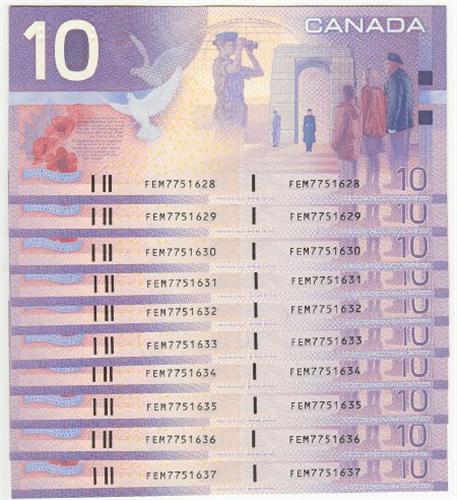 Bank of Canada; $10.00 insert 2002, BC-63bA, Gem UNC, signature; Knight Dodge, serial; FEM7751628 to FEM7751637. Lot of 10 consecutive insert notes (replacement). From the same sheets as the previous lot.