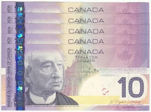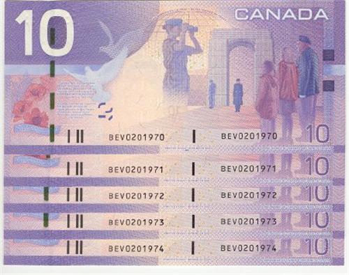 Bank of Canada; $10.00 insert 2004, BC-68aA, Gem UNC, signature; Jenkins Dodge, serial; BEV0201970-71-72-73-74. Lot of 5 consecutive insert notes (replacement).