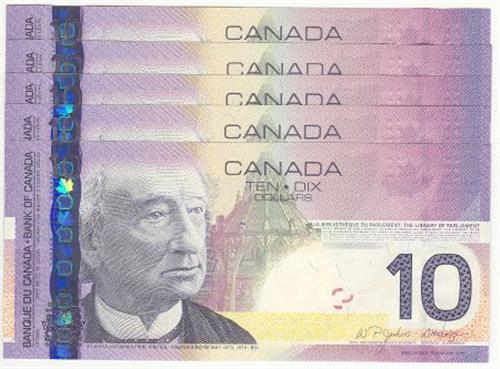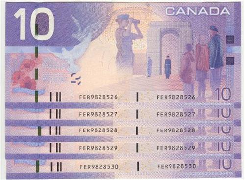 Bank of Canada; $10.00 insert 2004, BC-68aA-i, Gem UNC, signature; Jenkins Dodge, serial; FER9828526-27-28-29-30. Lot of 5 consecutive insert notes (replacement).
