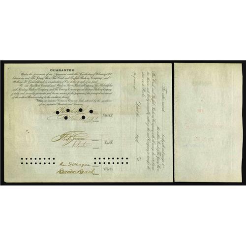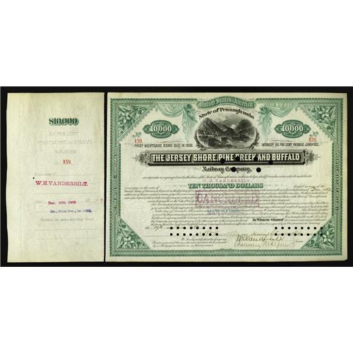 <B>Jersey Shore, Pine Creek and Buffalo Railway Co. $10,000 Bond</B></I><BR>Cornelius Vanderbilt (1843-1899), Financier, Philanthropist. Asst. Treasurer (1867) of New York & Harlem RR, then President from 1886 until his death. Trustee and benefactor of numerous colleges & universities in NY. Also signed by his brother William Kissam Vanderbilt (1849-1920), Chairman of the board of directors of Lake Shore & Michigan Southern RR (1883-1903); President of NY, Chicago & St Louis Rwy (1882-87). A third brother signs this bond, Frederick W. Vanderbilt (1856-1938), Capitalist, PHD from Yale. He worked in every department of his father's railroad system. This 1882, PA $10,000 engraved bond is signed by these three important sons of William H. Vanderbilt. Issued as well to William H. Vanderbilt and also signed by Chauncey M. Depew (legal advisor and right hand man of the Vanderbilt empire). The three sons include Cornelius and Frederick, signing at back (with moderate hole cancellations). The third son, Wm. K. Vanderbilt signs at front. His signature and Depew's are superb and untouched by the cancellation holes. Five matching portraits are included. One pinhole is noted at upper right corner, along with light handling along bottom. <B>Crisp Uncirculated,</B></I> PC.