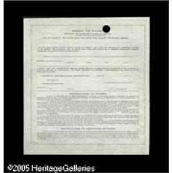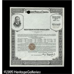 <B>$10,000 United States Savings Bond Series F.</B></I>This is an unissued example of the highest denomination U.S. Savings Bond issued to the public during the Second World War, the regulations having been changed in 1943 to allow holding bonds with a face value in excess of $5,000.There are no visible folds and a single circular POC at upper left. Other than this piece, which previously appeared in our 2002 FUN Auction, we have seen no other examples offered for sale. It sold at FUN for $3,565 against an estimate of $1,500-$2,500. It should reach or exceed its level of three years ago tonight. Lot:15558