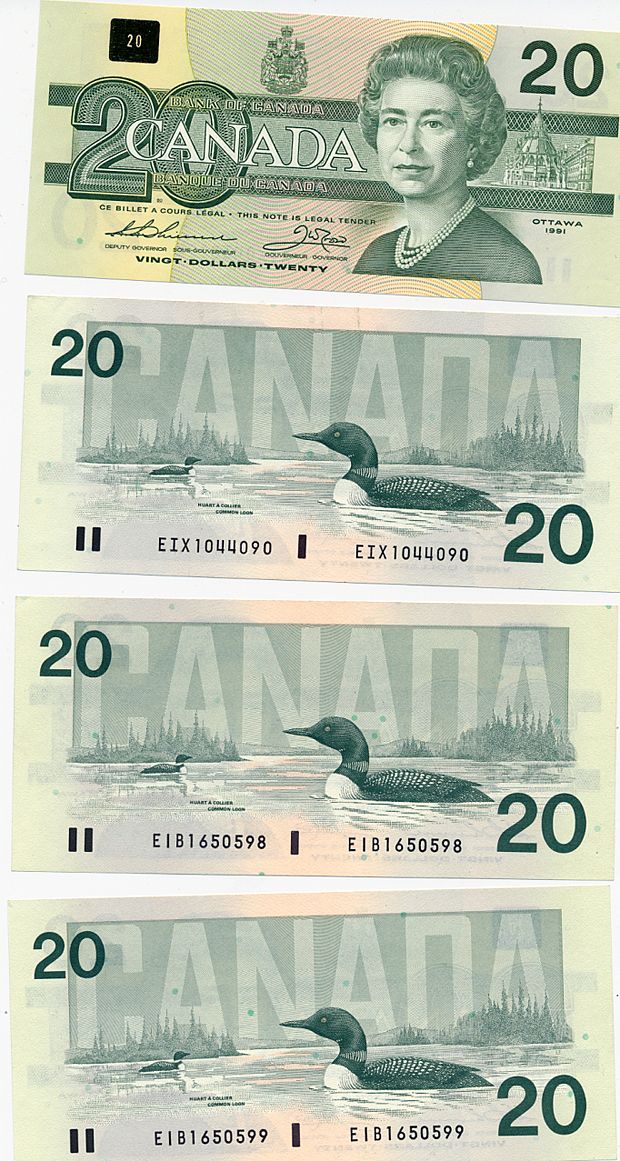 1991 Issue. BC-58a. Thiessen-Crow. No’s EIB1650598 & EIB1650599. Both AU; BC-58aA-i. No. EIX1044090. AU; BC-58aA-ii. No. AIX0438194. AU. Lot of four (4) notes.