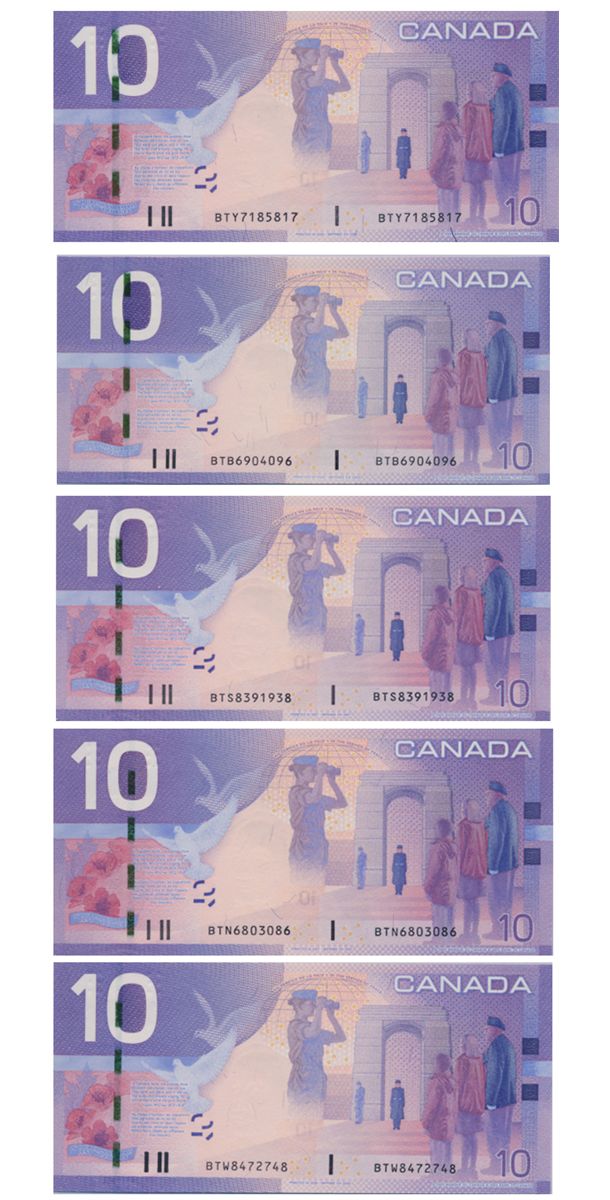 Issue of 2005. (Printed 2005). BC-68a. No. BTB6904096. Choice Unc-64; $10.00. Issue of 2005. (Printed 2007). BC-68a. No. BTS8391938. No. BTN6803086. Both Choice Unc-63; $10.00. Issue of 2005. (Printed 2008). BC-68b. No. BTW8472748. No. BTY7185817. Both Choice Unc-63. Lot of five (5) BCS graded four digit Radar notes.