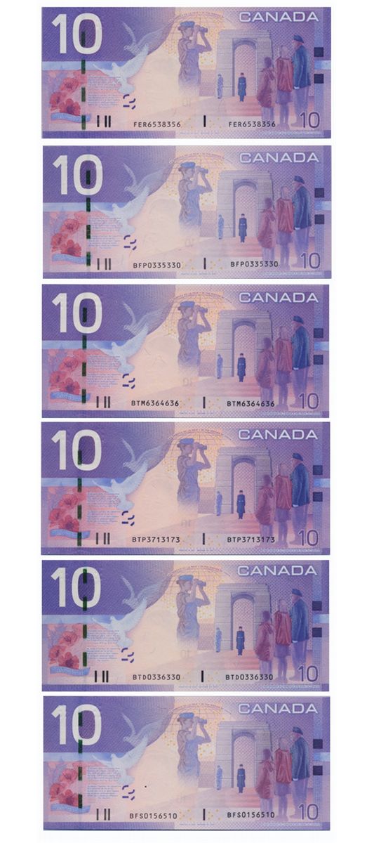 Issue of 2005. (Printed 2004). BC-68a-i. No. FER6538356. Choice Unc-63; $10.00. Issue of 2005. (Printed 2005). BC-68a. No. BTD0336330. Choice Unc-64; $10.00. Issue of 2005 (Printed 2007). No. BTP3713173. No. BTM6365636. Both Choice Unc-63; $10.00. Issue of 2005. (Printed 2009). BC-68b. No. BFS9156510. Gem Unc-66; No. BFP0335330. Choice Unc-64. Lot of six (6) BCS graded three and four digit Radar notes.