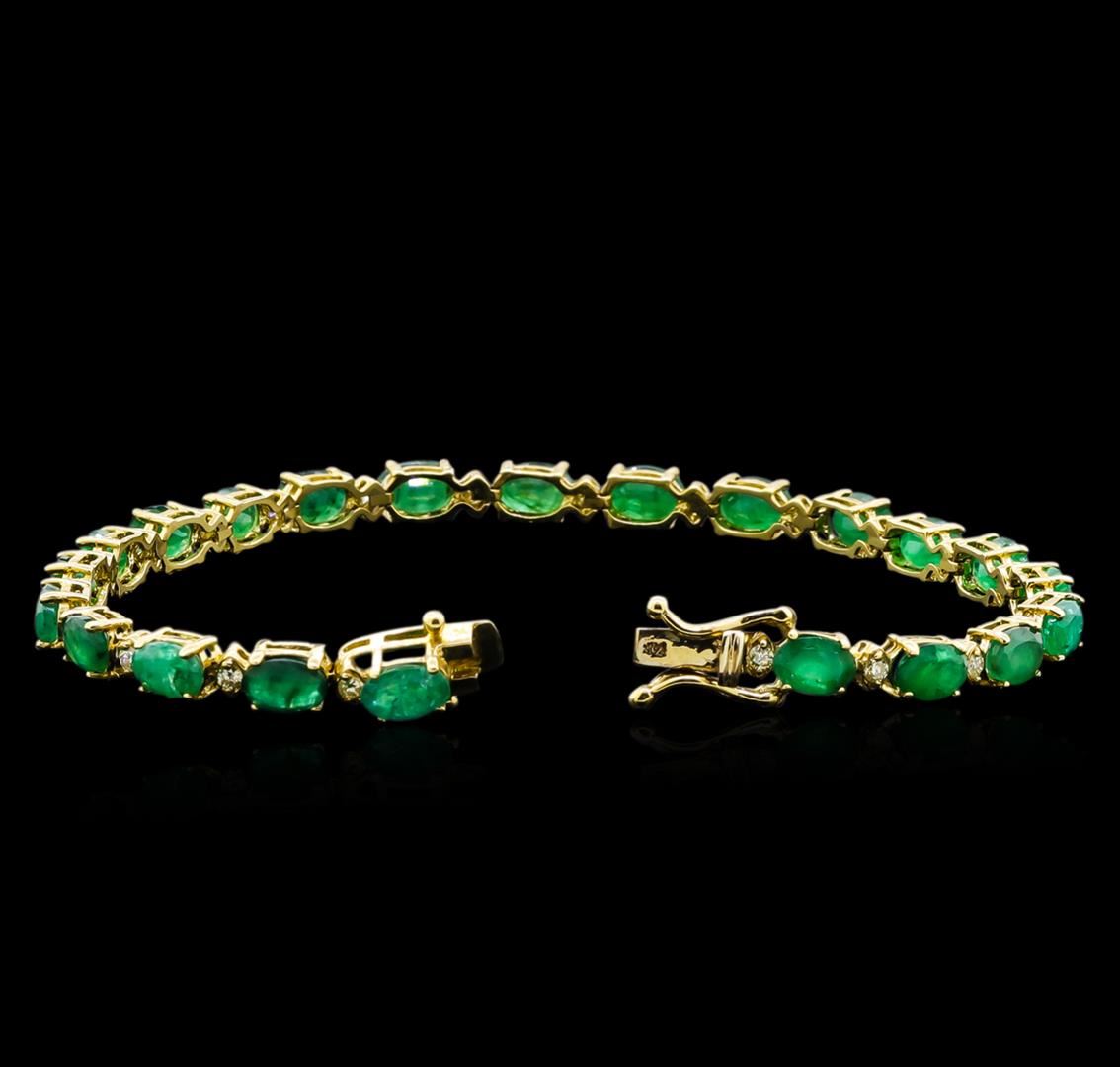 14K Yellow Gold 10CT Emerald 0.60CT Diamond Bracelet. Description: Meal: 14k solid yellow gold. Face Measurements: 4 x 185mm. Size: 7.25. Finish: bright polish. Total Item Weight: 9.0 grams. Markings: stamped 14K. Country Made: USA. Main Stone: emerald. Quantity: 22. Shape: oval. Color: green. Carat Total Weight: 10.00. Measurements: 4 x 6 mm. Treatment: none. Setting: prong. Hue: green. Saturation: moderately strong. Tone: dark. Clarity: type 2. Cut: very good. Secondary Stone: diamond. Quantity: 22. Shape: round. Color: white. Carat Total Weight: 0.60. Measurements: 1.7mm. Treatment: none Setting: prong. Color Grade: G-H. Clarity: SI1-SI2. Cut: very good. Excellent Workmanship. Gemstones graded in the mounting. BHGL Appraised at $11,680.00.