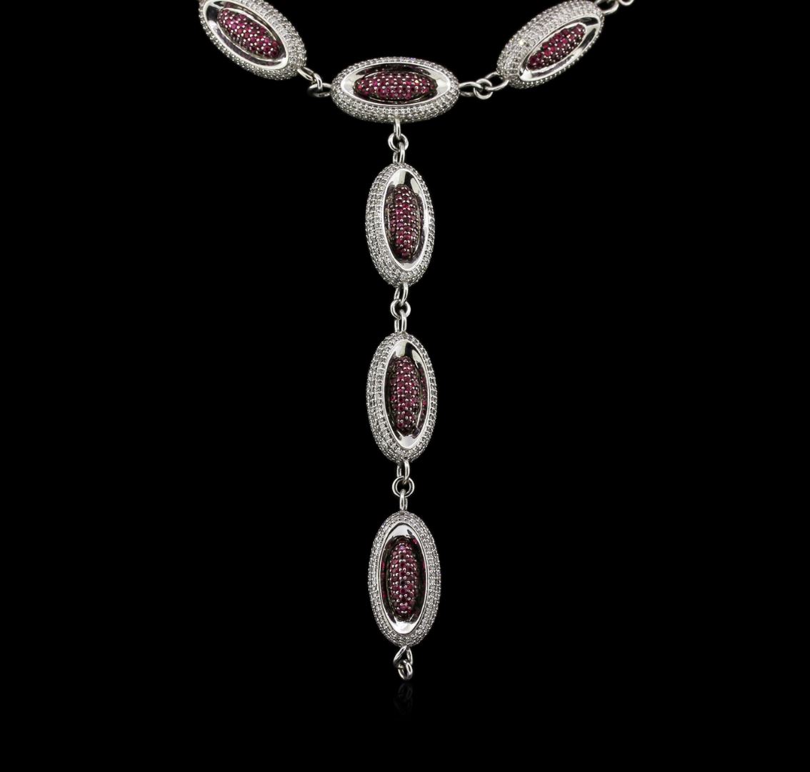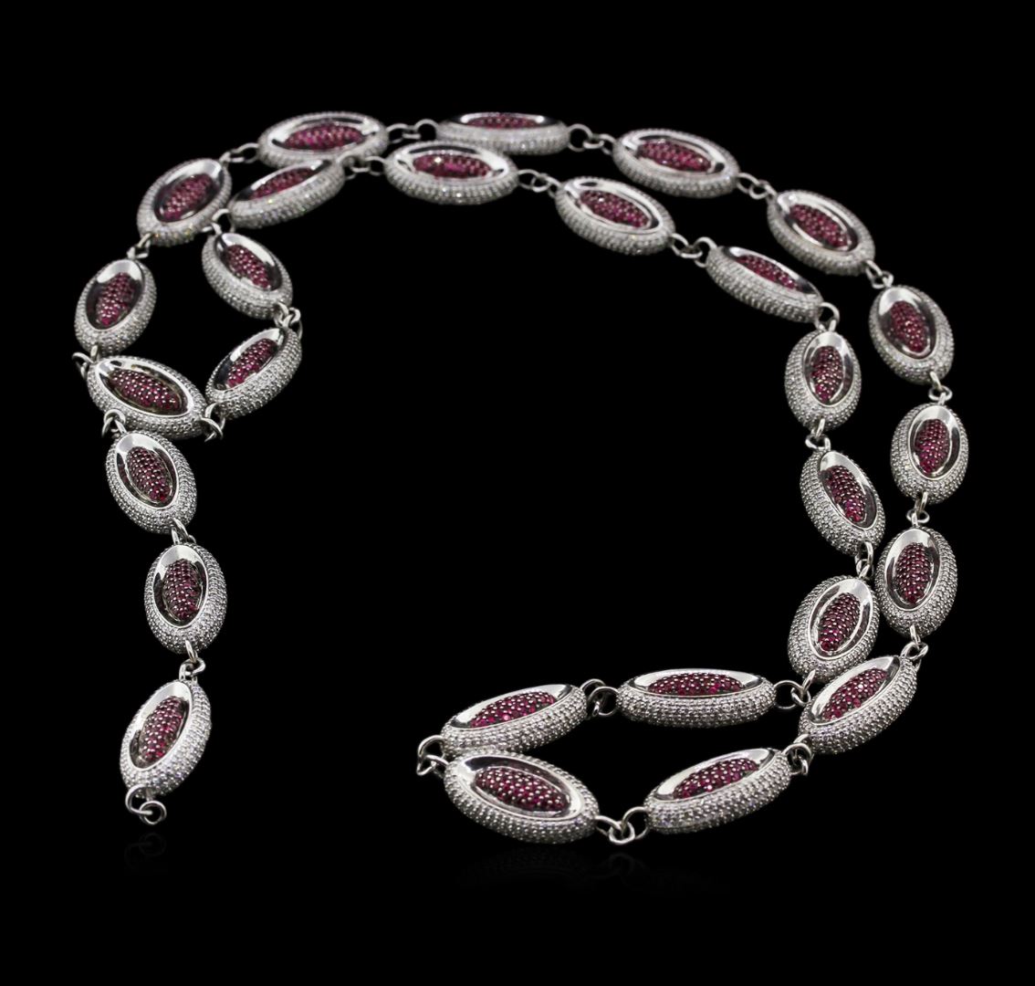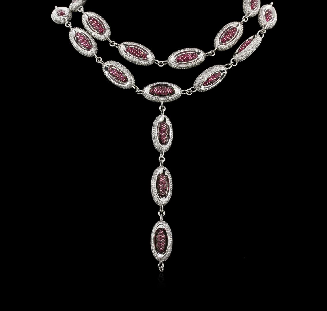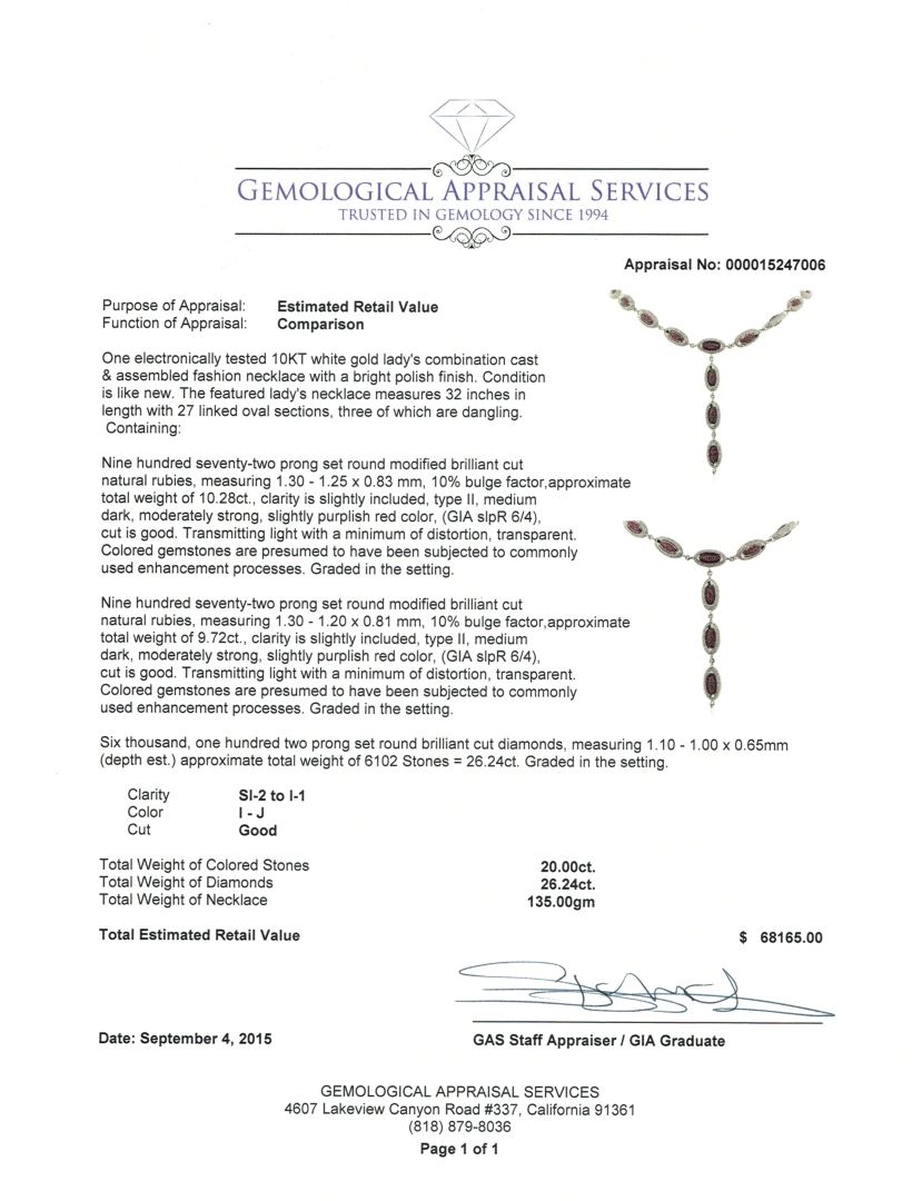 One electronically tested 10KT white gold lady's combination cast & assembled fashion necklace with a bright polish finish. The featured lady's necklace measures 32 inches in length with 27 linked oval sections, three of which are dangling. Condition is like new. Containing: Nine hundred seventy-two prong set round modified brilliant cut natural rubies, measuring 1.30 - 1.25 x 0.83 mm, 10% bulge factor, approximate total weight of 10.28ct., clarity is slightly included, type II, medium dark, moderately strong, slightly purplish red color, (GIA slpR 6/4), cut is good. Transmitting light with a minimum of distortion, transparent. Colored gemstones are presumed to have been subjected to commonly used enhancement processes. Graded in the setting. Nine hundred seventy-two prong set round modified brilliant cut natural rubies, measuring 1.30 - 1.20 x 0.81 mm, 10% bulge factor, approximate total weight of 9.72ct., clarity is slightly included, type II, medium dark, moderately strong, slightly purplish red color, (GIA slpR 6/4), cut is good. Transmitting light with a minimum of distortion, transparent. Colored gemstones are presumed to have been subjected to commonly used enhancement processes. Graded in the setting. Six Thousand, One Hundred Two prong set round brilliant cut diamonds, measuring 1.10 - 1.00 x 0.65mm (depth est.) approximate total weight of 6102 Stones = 26.24ct. Graded in the setting. Clarity: SI-2 to I-1. Color: I - Good. Total Weight of Colored Stones 20.00ct. Total Weight of Diamonds 26.24ct. Total Weight of Necklace135.00gm. GAS Appraised at $68,165.00.