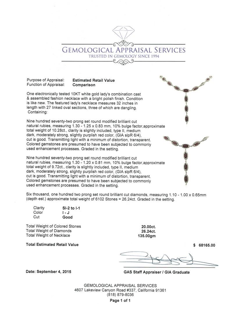 One electronically tested 10KT white gold lady's combination cast & assembled fashion necklace with a bright polish finish. The featured lady's necklace measures 32 inches in length with 27 linked oval sections, three of which are dangling. Condition is like new. Containing: Nine hundred seventy-two prong set round modified brilliant cut natural rubies, measuring 1.30 - 1.25 x 0.83 mm, 10% bulge factor, approximate total weight of 10.28ct., clarity is slightly included, type II, medium dark, moderately strong, slightly purplish red color, (GIA slpR 6/4), cut is good. Transmitting light with a minimum of distortion, transparent. Colored gemstones are presumed to have been subjected to commonly used enhancement processes. Graded in the setting. Nine hundred seventy-two prong set round modified brilliant cut natural rubies, measuring 1.30 - 1.20 x 0.81 mm, 10% bulge factor, approximate total weight of 9.72ct., clarity is slightly included, type II, medium dark, moderately strong, slightly purplish red color, (GIA slpR 6/4), cut is good. Transmitting light with a minimum of distortion, transparent. Colored gemstones are presumed to have been subjected to commonly used enhancement processes. Graded in the setting. Six Thousand, One Hundred Two prong set round brilliant cut diamonds, measuring 1.10 - 1.00 x 0.65mm (depth est.) approximate total weight of 6102 Stones = 26.24ct. Graded in the setting. Clarity: SI-2 to I-1. Color: I - Good. Total Weight of Colored Stones 20.00ct. Total Weight of Diamonds 26.24ct. Total Weight of Necklace135.00gm. GAS Appraised at $68,165.00.