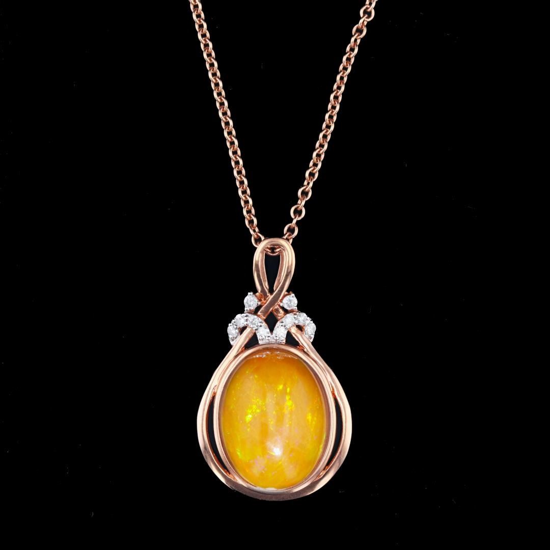 One electronically tested 14KT rose gold ladies cast and assembled opal and diamond pendant with chain. Condition is new, good workmanship. The pendant features an opal cabochon set within rose gold bezels, completed by a diamond accented bail. The pendant is supported by an eighteen inch length 14KT rose gold link chain, terminating in a lobster claw clasp. Bright polish finish with rhodium accents. Trademark is A. I. Identified with markings of "14K". One bezel set oval cabochon cut natural Ethiopian opal, measuring 16.50 x 12.50 x 8.95mm, approximate weight of 10.01ct. The opal has a dull, multicolor play of color (fire) in a harlequin pattern a high dome a good cut no inclusions major dull spot in its brightness and pattern and is slightly directional. Graded in the setting. Ten prong set round brilliant cut diamonds approximate total weight of 10 Stones = 0.15ct. Graded in the setting. Clarity: I-1 to I-2 Color: F - G Total Weight of Colored Stones: 10.01ct. Total Weight of Diamonds: 0.15ct. Total Weight of Pendant With Chain: 8.71 gm #LREF-1945