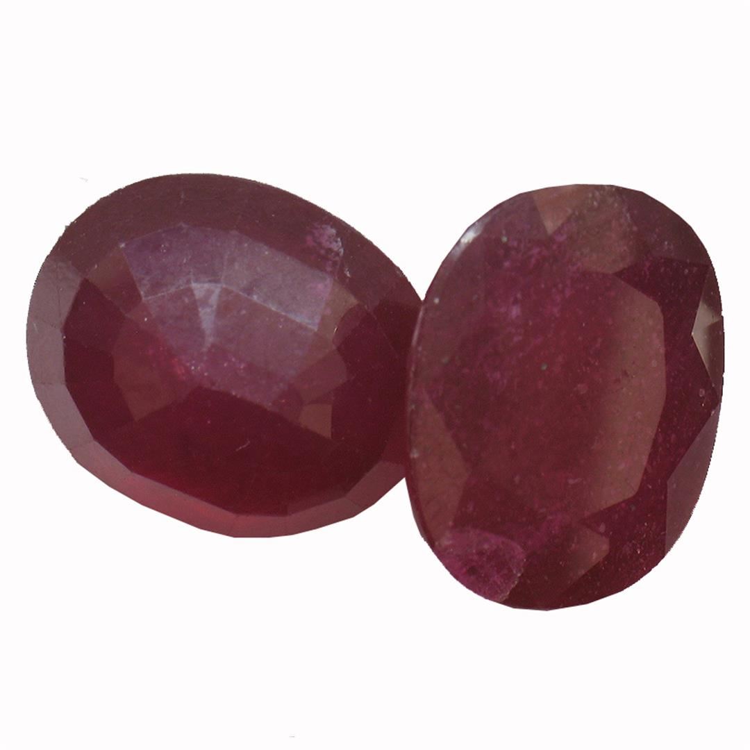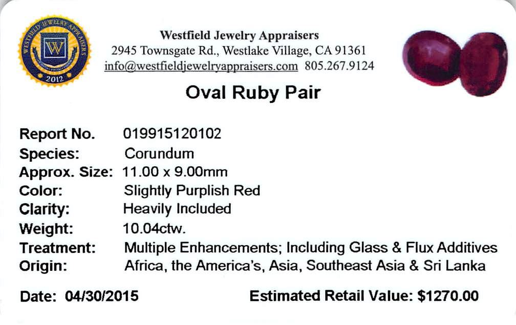 Two oval mixed cut natural rubies exact total weight 10.01ct., clarity is heavily included, type II, dark, very slightly brownish, slightly purplish red color, (GIA slpR 7/3), cut is good. Westfield Appraised at $1,270.00.